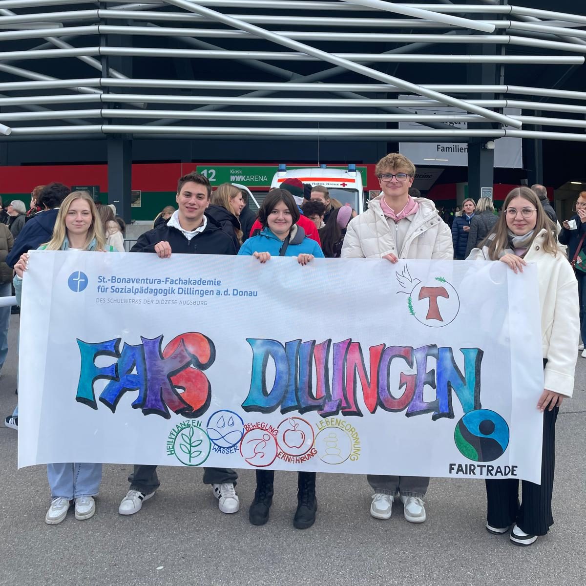 Am Freitag, den 10.10.2025, feierten über 20.000 Schülerinnen und Schüler, 2.300 Mitarbeitende aus 46 Schulen und auch unsere Studierenden, Berufspraktikant_innen und Lehrkräfte der Fachakademie in der WWK Arena Augsburg das 50-jährige Jubiläum unseres Trägers, des Schulwerks der Diözese Augsburg, unter dem Motto „Wie Adlern wachsen uns Flügel“.
