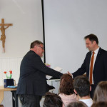 Der erste Teil des Gottesdienstes schloss zunächst mit dem ersten Höhepunkt für die Studierenden, der Verleihung der Missio (kirchliche Beauftragung) an einen Teil der Berufspraktikanten, welche sich entschlossen hatten, sich einer besonderen Ausbildung zur religiösen Erziehung von Kindern und Jugendlichen zu unterziehen. Nach ausgiebigen Dankesworten an Schulleiter Werner Eitle für die Möglichkeit dieser Zusatzqualifikation folgte nun die Überreichung der Eine-Welt-Zertifikate durch Herrn Eitle und Frau Falk. Der Gottesdienst endete feierlich mit dem Segen durch Pfarrer Schneck und dem ergreifenden Abschlusslied „Sowieso“ von Mark Forster zum Auszug.