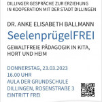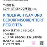 Frau Schmidt-Dendorfer ist Erziehungswissenschaftlerin, Theater-, Kommunikations- und Medienwissenschaftlerin. Als Mitarbeiterin der Akademie für bedürfnisorientierte Pädagogik war sie, auf Einladung der St.-Bonaventura-Fachakademie für Sozialpädagogik, in Zusammenarbeit mit den Städtischen Kindertagesstätten und der Stadtbibliothek Dillingen, am 03.04.2025 in die Aula der Grundschule Dillingen gekommen, um über bedürfnisorientierte Pädagogik zu sprechen.