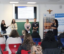 Bereits am Vormittag präsentierten Schulleiterin Tanja Barfüßer und Stellvertreterin Claudia Güller in ihrem gemeinsamen Vortrag die Ausbildungswege, Inhalte und Perspektiven. Studierende berichteten offen aus ihrem Schulalltag, von Projekten und Praxiserfahrungen und machten deutlich, wie vielseitig die Ausbildung ist.
