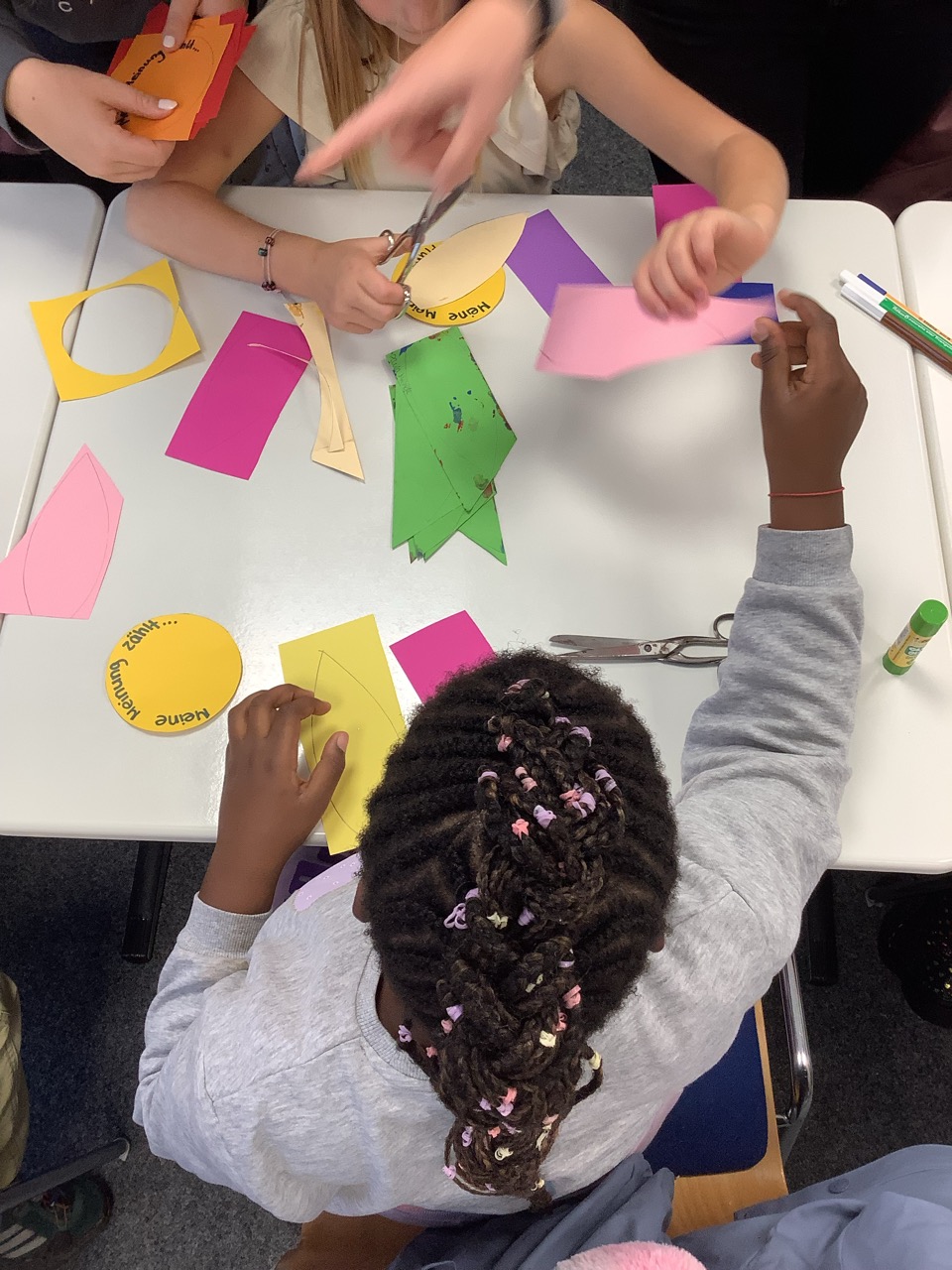 Der letzte Teil der Einheit war sehr praxisorientiert. Die Studierenden schlossen sich Arbeitsgruppen an, in denen sie Cometas – drachenförmige Symbole des Friedens -, Papierperlenketten oder etwas Kreatives zum Pappkarton bastelten, aber auch Angebote zum Märchen „Sternenkinder“ oder zur Gründerin des Kindermissionswerkes erstellten.