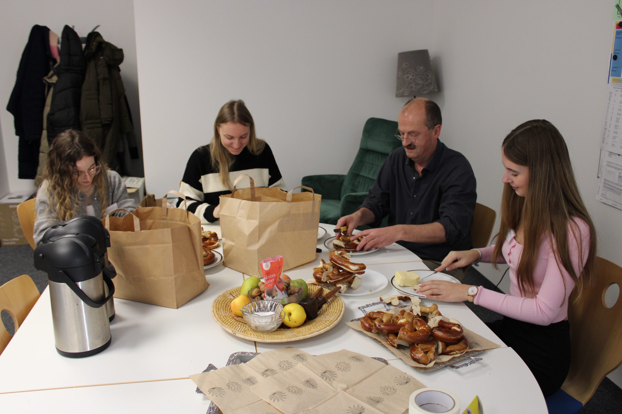 Um unsere Studierenden mit genügend Power für die „Knaxiade“ – unser alljährliches Schulsportfest – zu versorgen, hatte die Fairtrade-Gruppe der Fachakademie am 23.03.2018 ein reichhaltiges gesundes Büffet zusammengestellt. Als Fairtrade-Schule wurde darauf geachtet, saisonale und regionale Produkte anzubieten: So gab es Apfelsaft aus unseren Gartenäpfeln ebenso wie fair gehandelten Orangensaft. Sehr gefragt waren die Gemüse-Rohkoststicks und selbstgemachte Joghurt-Dips. Eine lokale Bäckerei belieferte uns mit frischen Brötchen, die mit vielen verschiedenen selbstgemachten Brotaufstrichen zu feinen Köstlichkeiten zubereitet wurden. Aus dem Dillinger Eine-Weltladen holten wir uns vitaminreiche Energie durch fair gehandelte Bananen und Nüsse. Auf die hübschen Osterschokoladen und die feinen Zitronenkekse aus unserem Dillinger –Eine-Weltladen wollten wir – trotz Fastenzeit – nicht verzichten.